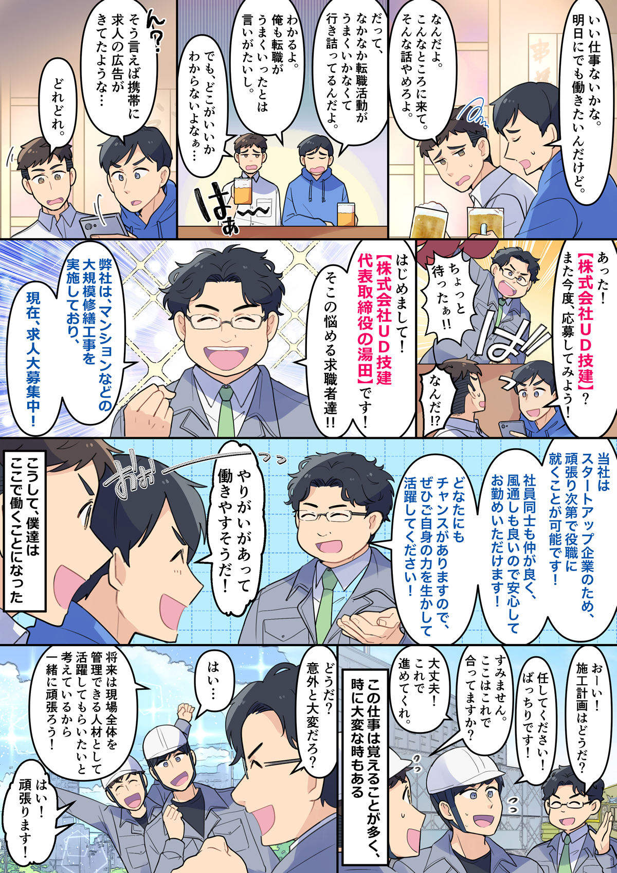 UD技建は設立以来、埼玉・茨城・千葉・東京にて、大規模修繕工事の施工管理を含めた建築工事一式を請け負っております。この度、弊社では事業拡大に伴い現場監督、現場代理人業務をお手伝いして頂ける方を募集しております。 経験の有無や年齢を問わず広く募集しているため、しっかり稼ぎたい方、地元地域で働きたい方など、お気軽にご応募ください。教育体制も整っており、一から丁寧に指導を行います。 前向きで真面目に取り組んでくださる方のご応募お待ちしております。